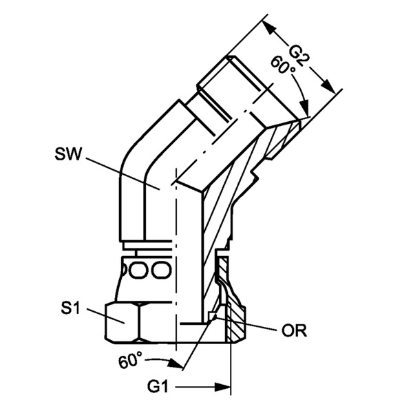 Hydr. Adaptor, Vinkel 45 °: Omløber/Han - BSP, Konus m/O-ring, 24 ° / BSP, Udkravning, 60 °