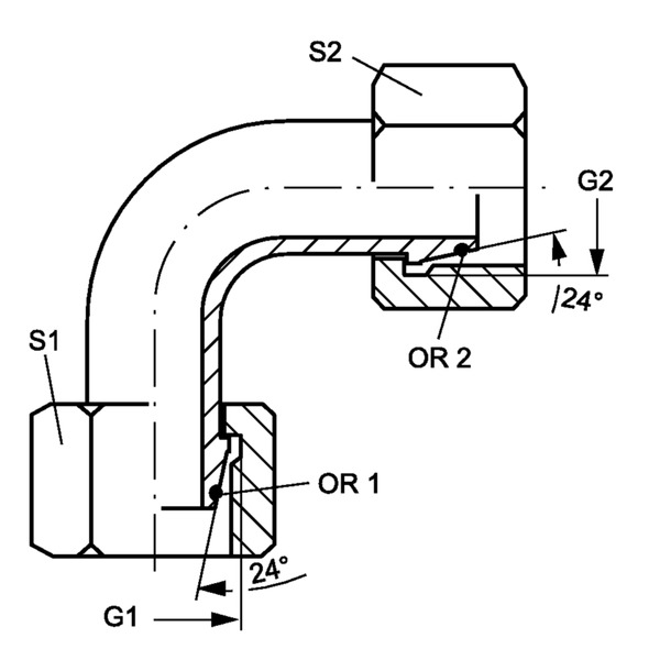Hydr. Adaptor, Vinkel 90 °: Omløber/Omløber - DIN - Metric, Konus m/O-ring, 24 ° / DIN - Metric, Konus m/O-ring, 24 °