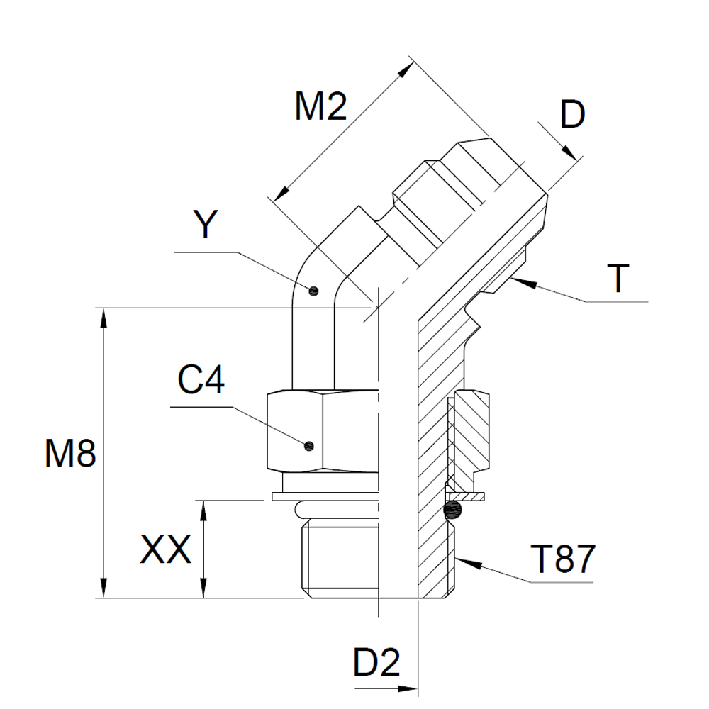 45° Male Stud Elbow - 37° Flare end / Male metric thread O-ring