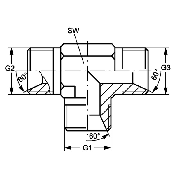 Hydr. Adaptor, TEE: Male/Male/Male - BSP, Flare, 60 ° / BSP, Flare, 60 ° / BSP Flare, 60 °